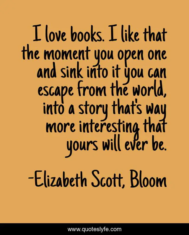 This page presents the quote "I love books. I like that the moment you open one and sink into it you can escape from the world, into a story that's way more interesting that yours will ever be.". Author of this quote is Elizabeth Scott, Bloom. .
