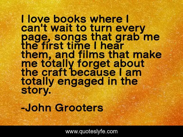 This page presents the quote "I love books where I can't wait to turn every page, songs that grab me the first time I hear them, and films that make me totally forget about the craft because I am totally engaged in the story.". Author of this quote is John Grooters. This quote is about grab, engaged, story, forget,.