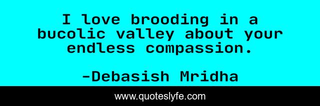 This page presents the quote "I love brooding in a bucolic valley about your endless compassion.". Author of this quote is Debasish Mridha. This quote is about endless-compassion, compassion, philosophy, debasish-mridha, quotes, bucolic-valley, debasish-mridha-md, inspirational, enthusiasm,.