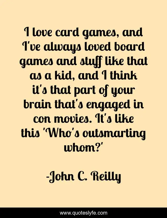 This page presents the quote "I love card games, and I've always loved board games and stuff like that as a kid, and I think it's that part of your brain that's engaged in con movies. It's like this 'Who's outsmarting whom?'". Author of this quote is John C. Reilly. This quote is about brain, love, think, affection,.