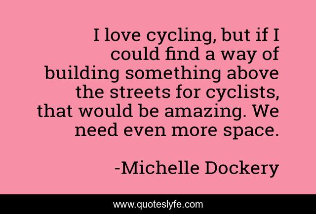 This page presents the quote "I love cycling, but if I could find a way of building something above the streets for cyclists, that would be amazing. We need even more space.". Author of this quote is Michelle Dockery. This quote is about building, amazing, love, affection,.