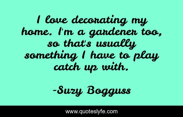 This page presents the quote "I love decorating my home. I'm a gardener too, so that's usually something I have to play catch up with.". Author of this quote is Suzy Bogguss. This quote is about home, play, love, affection,.