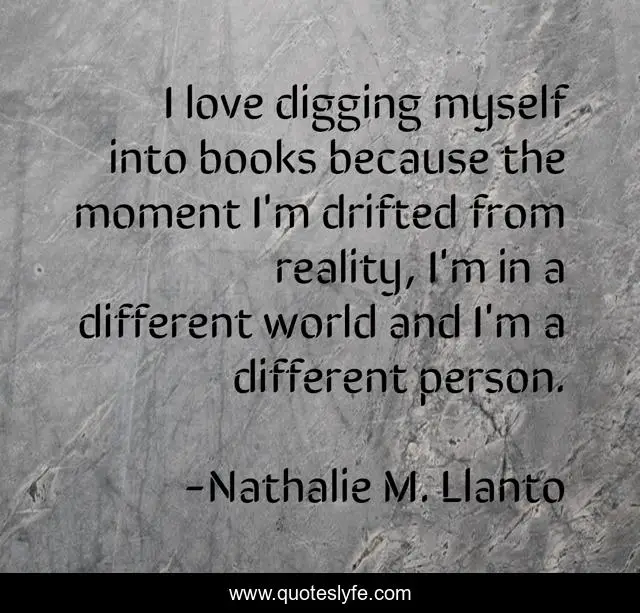 This page presents the quote "I love digging myself into books because the moment I'm drifted from reality, I'm in a different world and I'm a different person.". Author of this quote is Nathalie M. Llanto. This quote is about books, reading, reality,.