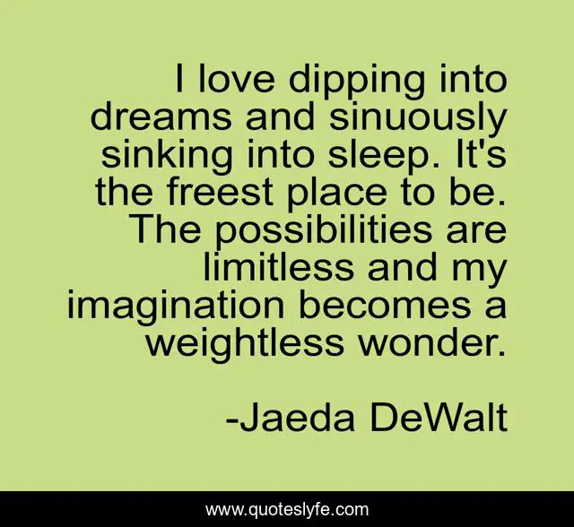 This page presents the quote "I love dipping into dreams and sinuously sinking into sleep. It's the freest place to be. The possibilities are limitless and my imagination becomes a weightless wonder.". Author of this quote is Jaeda DeWalt. This quote is about imagination, sleep, inspirational, dreaming, enthusiasm, dreams, wonder,.