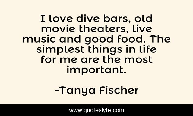 This page presents the quote "I love dive bars, old movie theaters, live music and good food. The simplest things in life for me are the most important.". Author of this quote is Tanya Fischer. This quote is about love, life, music, affection,.