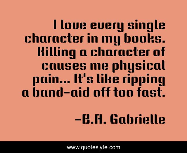 This page presents the quote "I love every single character in my books. Killing a character of causes me physical pain... It's like ripping a band-aid off too fast.". Author of this quote is B.A. Gabrielle. .