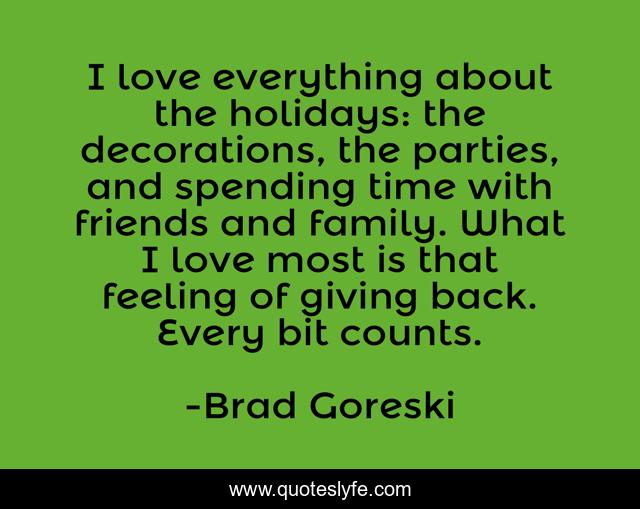 This page presents the quote "I love everything about the holidays: the decorations, the parties, and spending time with friends and family. What I love most is that feeling of giving back. Every bit counts.". Author of this quote is Brad Goreski. This quote is about love, friends, affection, time,.