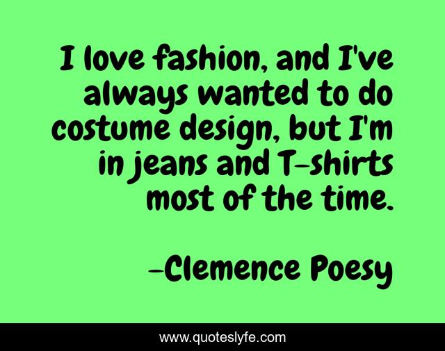 This page presents the quote "I love fashion, and I've always wanted to do costume design, but I'm in jeans and T-shirts most of the time.". Author of this quote is Clemence Poesy. This quote is about fashion, love, affection, time,.