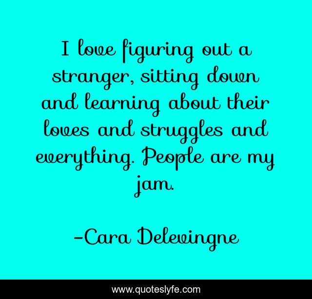 This page presents the quote "I love figuring out a stranger, sitting down and learning about their loves and struggles and everything. People are my jam.". Author of this quote is Cara Delevingne. This quote is about down, love, affection, people,.