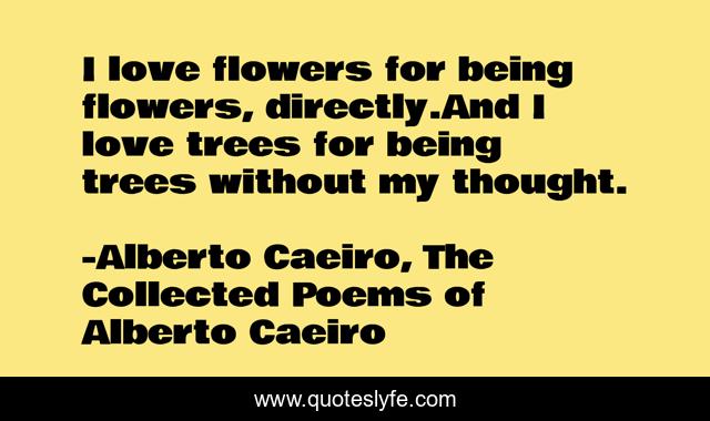This page presents the quote "I love flowers for being flowers, directly.And I love trees for being trees without my thought.". Author of this quote is Alberto Caeiro, The Collected Poems of Alberto Caeiro. This quote is about seeing, pantheism, love, beauty, being, reality, it-is-what-it-is, truth, existence,.