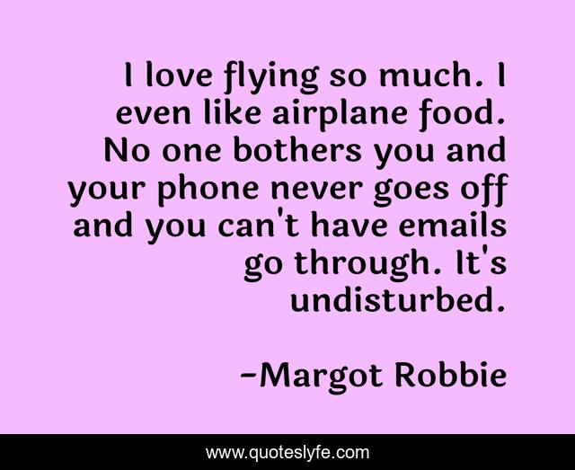 This page presents the quote "I love flying so much. I even like airplane food. No one bothers you and your phone never goes off and you can't have emails go through. It's undisturbed.". Author of this quote is Margot Robbie. This quote is about airplane, flying, love, affection,.