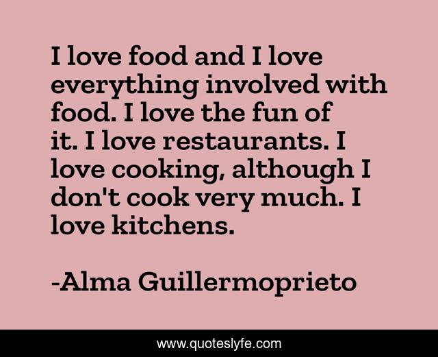 This page presents the quote "I love food and I love everything involved with food. I love the fun of it. I love restaurants. I love cooking, although I don't cook very much. I love kitchens.". Author of this quote is Alma Guillermoprieto. This quote is about fun, cooking, love, affection,.