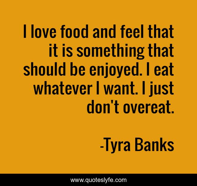 This page presents the quote "I love food and feel that it is something that should be enjoyed. I eat whatever I want. I just don't overeat.". Author of this quote is Tyra Banks. This quote is about feel, love, affection,.