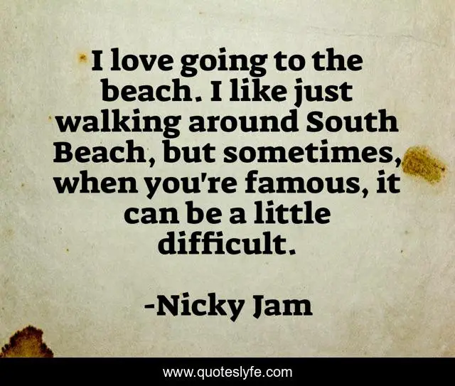 This page presents the quote "I love going to the beach. I like just walking around South Beach, but sometimes, when you're famous, it can be a little difficult.". Author of this quote is Nicky Jam. This quote is about love, walking, beach, affection,.