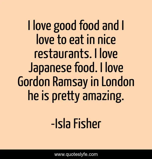 This page presents the quote "I love good food and I love to eat in nice restaurants. I love Japanese food. I love Gordon Ramsay in London he is pretty amazing.". Author of this quote is Isla Fisher. This quote is about love, good, good food, affection,.