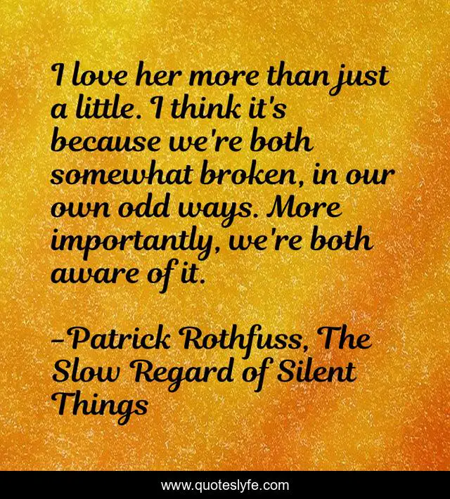 This page presents the quote "I love her more than just a little. I think it's because we're both somewhat broken, in our own odd ways. More importantly, we're both aware of it.". Author of this quote is Patrick Rothfuss, The Slow Regard of Silent Things. This quote is about love, feelings, romance, connection, auri, affection,.