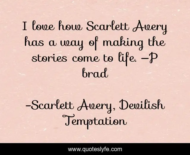 This page presents the quote "I love how Scarlett Avery has a way of making the stories come to life. —P brad". Author of this quote is Scarlett Avery, Devilish Temptation. This quote is about british-rendezvous, erotic-romance, black-guys, menage-a-trois, curvy, interracial, romance-books, alpha-males, bbw,.