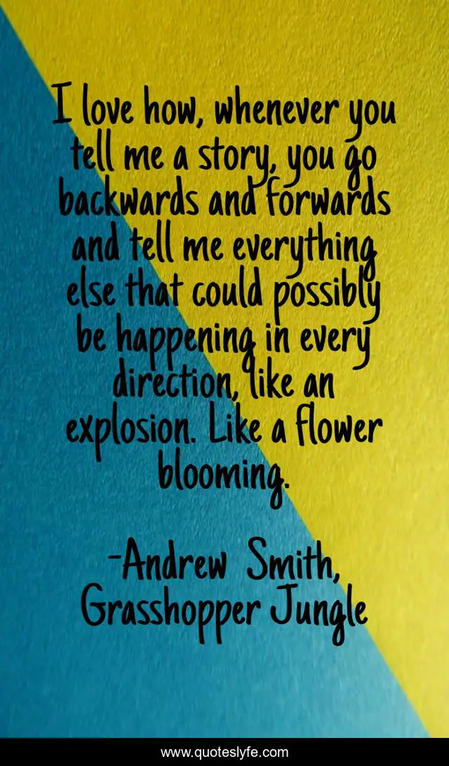 This page presents the quote "I love how, whenever you tell me a story, you go backwards and forwards and tell me everything else that could possibly be happening in every direction, like an explosion. Like a flower blooming.". Author of this quote is Andrew Smith, Grasshopper Jungle. This quote is about everything, explosion, stories,.