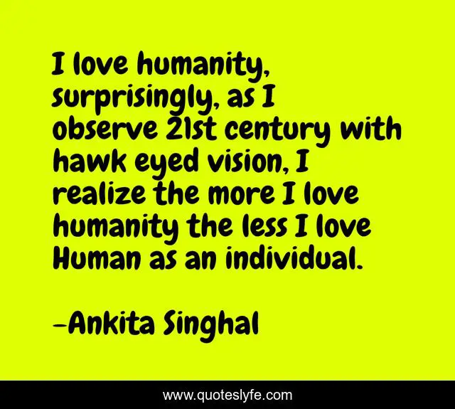 This page presents the quote "I love humanity, surprisingly, as I observe 21st century with hawk eyed vision, I realize the more I love humanity the less I love Human as an individual.". Author of this quote is Ankita Singhal. This quote is about 21st-century, doomed, humanity, human, human-nature,.