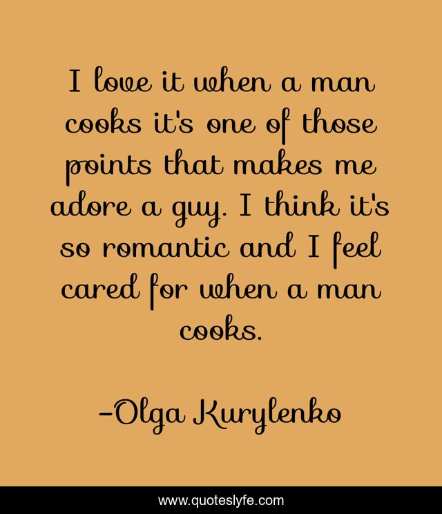 This page presents the quote "I love it when a man cooks it's one of those points that makes me adore a guy. I think it's so romantic and I feel cared for when a man cooks.". Author of this quote is Olga Kurylenko. This quote is about me, love, affection, man,.