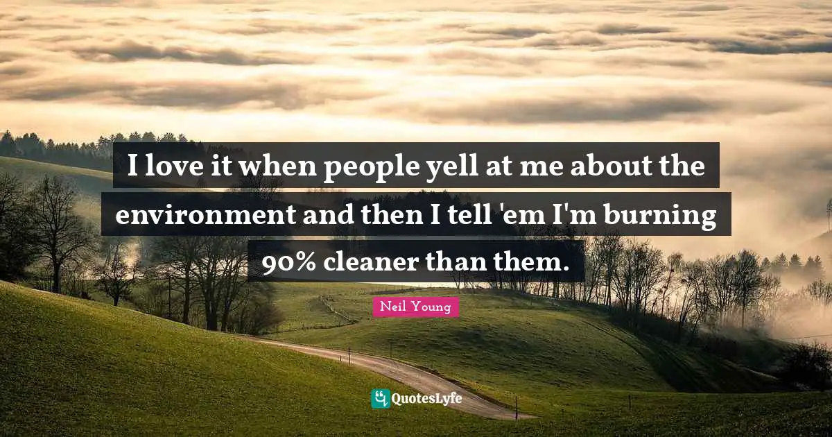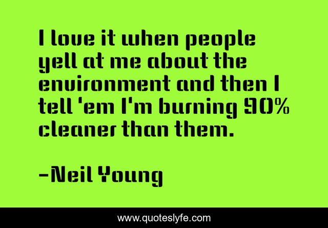 This page presents the quote "I love it when people yell at me about the environment and then I tell 'em I'm burning 90% cleaner than them.". Author of this quote is Neil Young. This quote is about ecology, environment, green, clean-energy, biofuels, save-the-planet,.