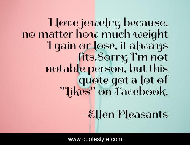 This page presents the quote "I love jewelry because, no matter how much weight I gain or lose, it always fits.Sorry I'm not notable person, but this quote got a lot of "Likes" on Facebook.". Author of this quote is Ellen Pleasants. This quote is about fashion, jewelry, weight,.