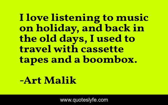 This page presents the quote "I love listening to music on holiday, and back in the old days, I used to travel with cassette tapes and a boombox.". Author of this quote is Art Malik. This quote is about love, music, listening, affection,.