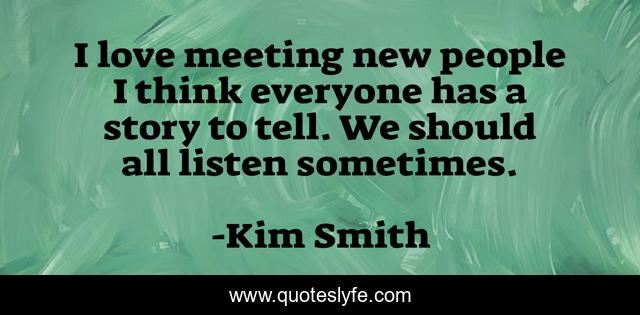 This page presents the quote "I love meeting new people I think everyone has a story to tell. We should all listen sometimes.". Author of this quote is Kim Smith. This quote is about meeting, think, people,.