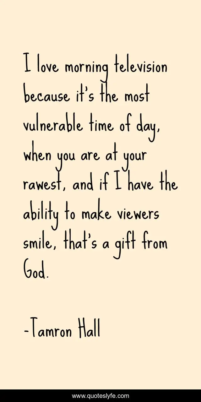 This page presents the quote "I love morning television because it's the most vulnerable time of day, when you are at your rawest, and if I have the ability to make viewers smile, that's a gift from God.". Author of this quote is Tamron Hall. This quote is about smile, love, affection, happiness, time,.