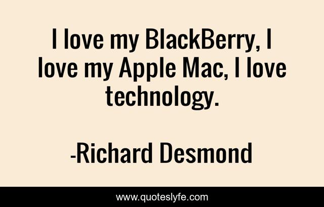 This page presents the quote "I love my BlackBerry, I love my Apple Mac, I love technology.". Author of this quote is Richard Desmond. This quote is about love, apple, affection, blackberry,.
