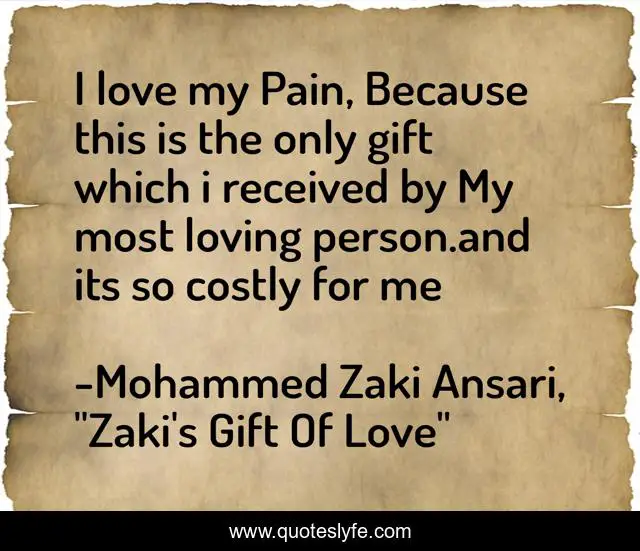 This page presents the quote "I love my Pain, Because this is the only gift which i received by My most loving person.and its so costly for me". Author of this quote is Mohammed Zaki Ansari, "Zaki's Gift Of Love". This quote is about pain, hurt,.