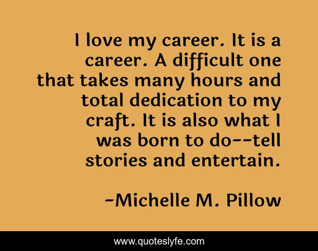 This page presents the quote "I love my career. It is a career. A difficult one that takes many hours and total dedication to my craft. It is also what I was born to do--tell stories and entertain.". Author of this quote is Michelle M. Pillow. This quote is about genre-fiction, love, destiny, writing-life, author, career, author-life, fiction, fiction-writing,.