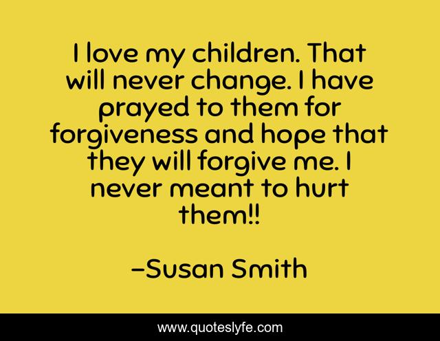 This page presents the quote "I love my children. That will never change. I have prayed to them for forgiveness and hope that they will forgive me. I never meant to hurt them!!". Author of this quote is Susan Smith. This quote is about change, love, hope, affection,.