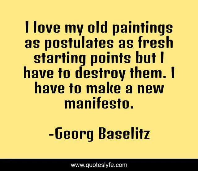 This page presents the quote "I love my old paintings as postulates as fresh starting points but I have to destroy them. I have to make a new manifesto.". Author of this quote is Georg Baselitz. This quote is about art, wisdom,.