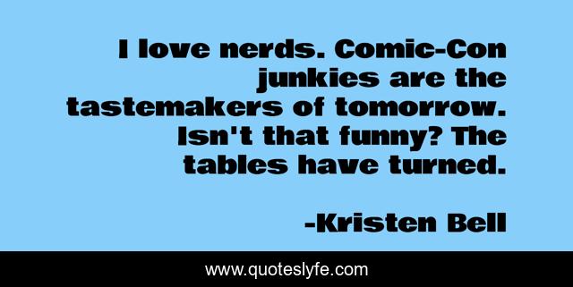 This page presents the quote "I love nerds. Comic-Con junkies are the tastemakers of tomorrow. Isn't that funny? The tables have turned.". Author of this quote is Kristen Bell. This quote is about love, tomorrow, affection, nerds,.