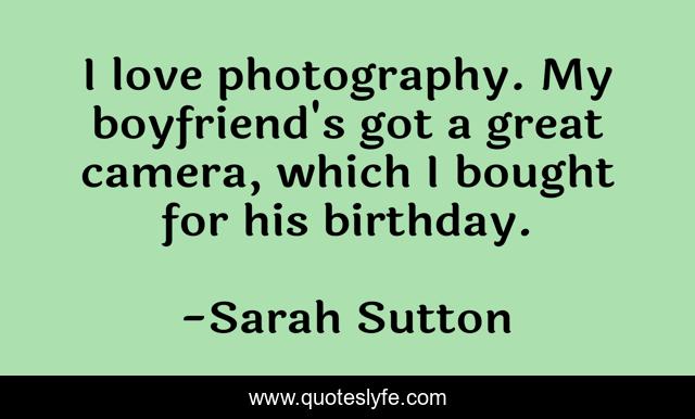 This page presents the quote "I love photography. My boyfriend's got a great camera, which I bought for his birthday.". Author of this quote is Sarah Sutton. This quote is about great, love, photography, affection,.