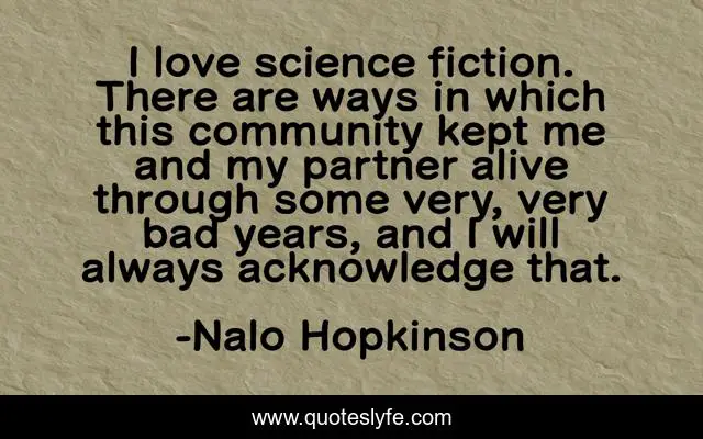 This page presents the quote "I love science fiction. There are ways in which this community kept me and my partner alive through some very, very bad years, and I will always acknowledge that.". Author of this quote is Nalo Hopkinson. This quote is about me, love, community, affection,.