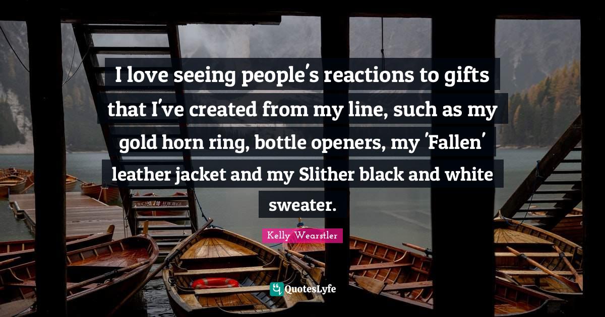 This page presents the quote "I love seeing people's reactions to gifts that I've created from my line, such as my gold horn ring, bottle openers, my 'Fallen' leather jacket and my Slither black and white sweater.". Author of this quote is Kelly Wearstler. This quote is about seeing, black and white, affection, leather, people, reactions, fallen, leather jackets, love,.