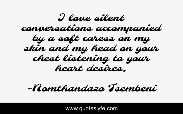 This page presents the quote "I love silent conversations accompanied by a soft caress on my skin and my head on your chest listening to your heart desires.". Author of this quote is Nomthandazo Tsembeni. This quote is about desire, love, silence, affection,.