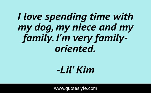 This page presents the quote "I love spending time with my dog, my niece and my family. I'm very family-oriented.". Author of this quote is Lil' Kim. This quote is about love, dog, affection, time,.