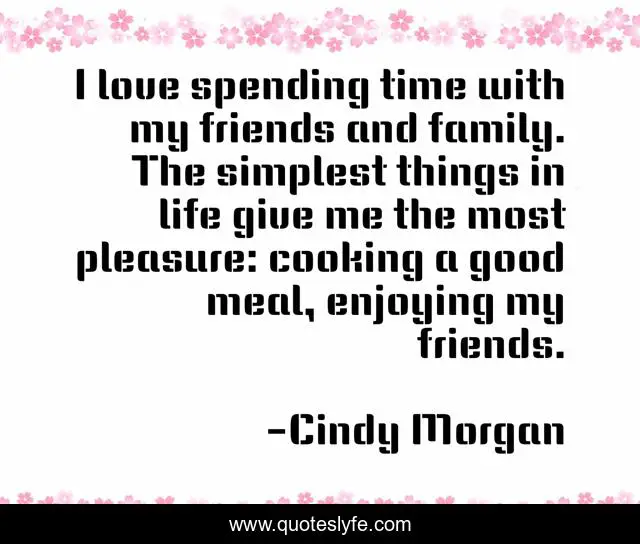 This page presents the quote "I love spending time with my friends and family. The simplest things in life give me the most pleasure: cooking a good meal, enjoying my friends.". Author of this quote is Cindy Morgan. This quote is about life, family, time,.