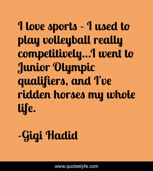 This page presents the quote "I love sports - I used to play volleyball really competitively...I went to Junior Olympic qualifiers, and I've ridden horses my whole life.". Author of this quote is Gigi Hadid. This quote is about life, love, play, affection,.