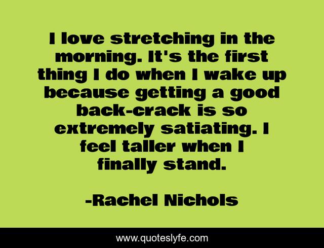 This page presents the quote "I love stretching in the morning. It's the first thing I do when I wake up because getting a good back-crack is so extremely satiating. I feel taller when I finally stand.". Author of this quote is Rachel Nichols. This quote is about wake up, good, love, affection,.