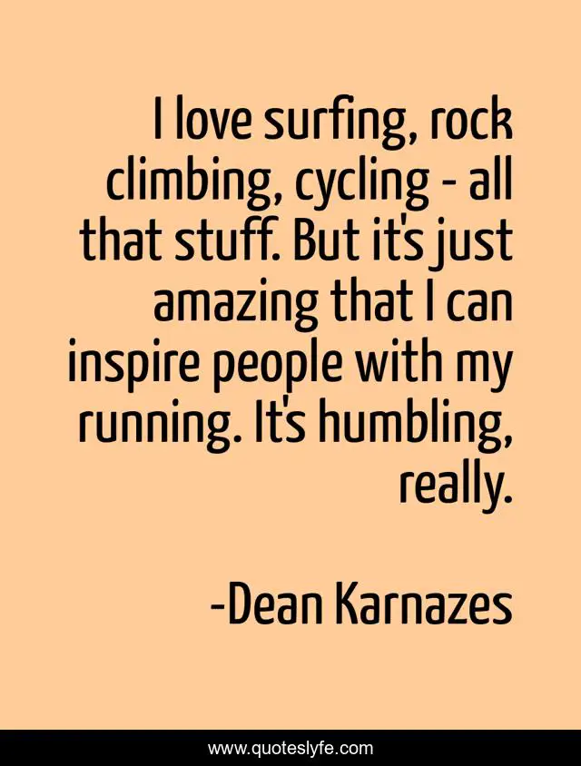This page presents the quote "I love surfing, rock climbing, cycling - all that stuff. But it's just amazing that I can inspire people with my running. It's humbling, really.". Author of this quote is Dean Karnazes. This quote is about love, inspire, affection, people,.