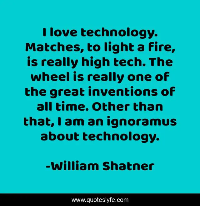 This page presents the quote "I love technology. Matches, to light a fire, is really high tech. The wheel is really one of the great inventions of all time. Other than that, I am an ignoramus about technology.". Author of this quote is William Shatner. This quote is about light, love, affection, time,.