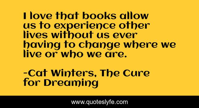 This page presents the quote "I love that books allow us to experience other lives without us ever having to change where we live or who we are.". Author of this quote is Cat Winters, The Cure for Dreaming. .