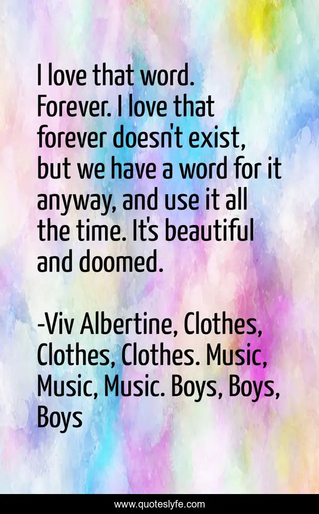 "Viv Albertine, Clothes, Clothes, Clothes. Music, Music, Music. Boys, Boys, Boys Quotes." Quoteslyfe.com, 2025. Sat. 06 Dec. 2025. <https://www.quoteslyfe.com/quote/I-love-that-word-Forever-I-love-113169>.