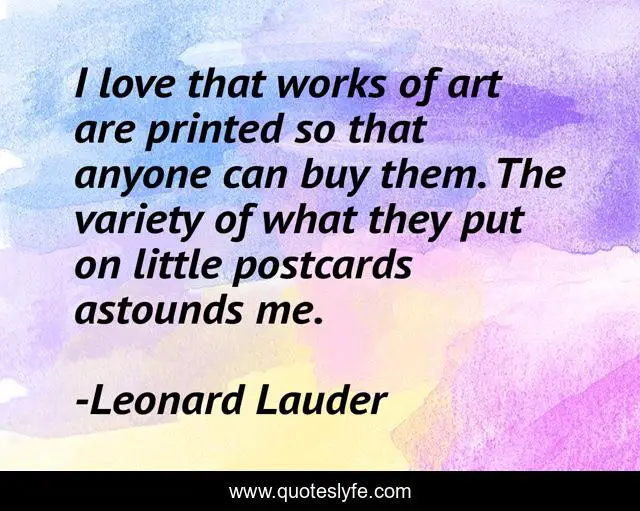 This page presents the quote "I love that works of art are printed so that anyone can buy them. The variety of what they put on little postcards astounds me.". Author of this quote is Leonard Lauder. This quote is about me, little, love, affection,.