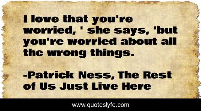This page presents the quote "I love that you're worried, ' she says, 'but you're worried about all the wrong things.". Author of this quote is Patrick Ness, The Rest of Us Just Live Here. .