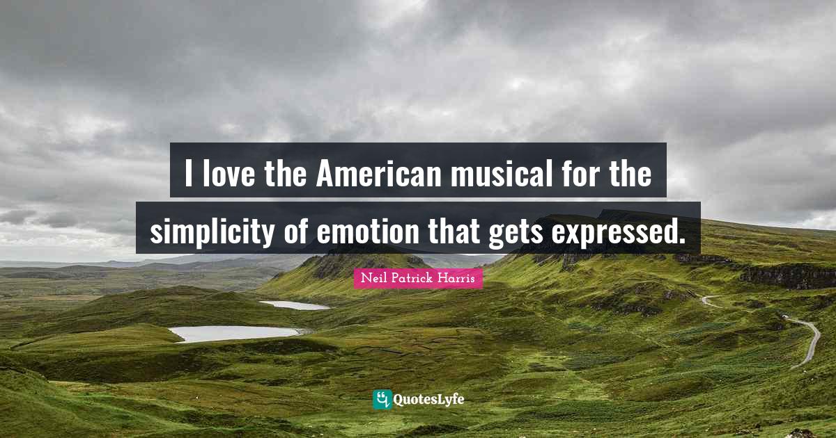 This page presents the quote "I love the American musical for the simplicity of emotion that gets expressed.". Author of this quote is Neil Patrick Harris. This quote is about musical, emotion, affection, love, simplicity,.